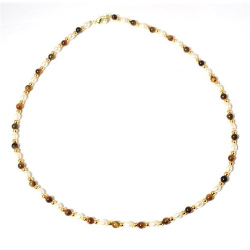 La Olivia Collection vous présente ce superbe collier composé de perles deau douce et de perles colorées rondes oeil de tigre mesurant 4mm alternant avec des perles deau douce blanches de 4mm et des perles en or plaqué entre les perles oeils de tigre . Les perles blanches et celles oeil de tigre sont polies et le collier a un fermoir doré qui le complète joliment. Vous ne voudrez plus être vue sans ce collier!. 1