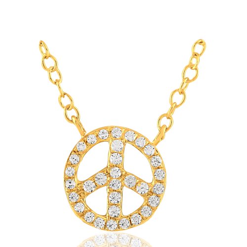 Collier peace & love en or jaune 18 carats 750/1000, serti griffes de 33 diamants blancs ronds qualité Hsi de 0,13 carat. Son poids d' or est de 2,72 grammes. Chaîne de longueur de 42 cm avec fermoir mousqueton. Disponible aussi en or blanc ou en or rose.