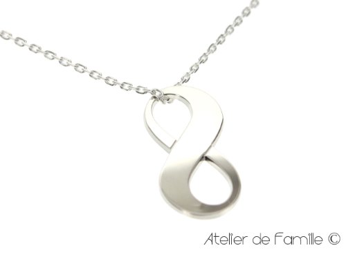 Ce collier pouvant représenter un nombre infini d'histoires est constitué d'un petit symbole infini (d'une longueur totale de 2,5 cm et d'une largeur d'1 cm) en argent massif 925/1000, monté sur une chaîne maille forçat de 40 cm.